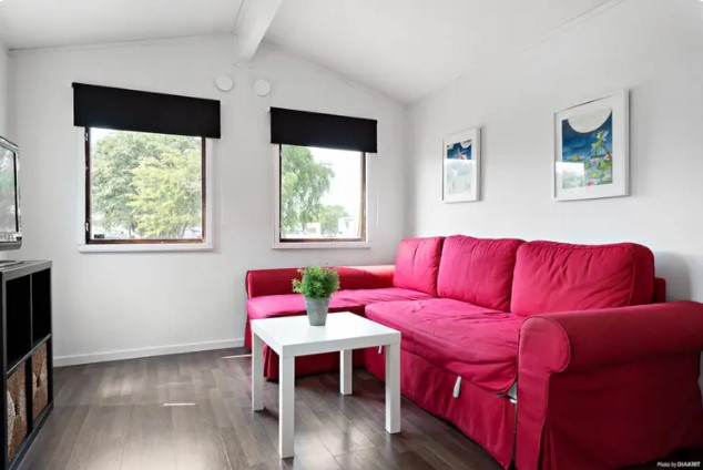 Stuga 41 (grå): Ett plan med fyra bäddar – två enkelsängar i sovrummet och två bäddar i soffan i allrummet.